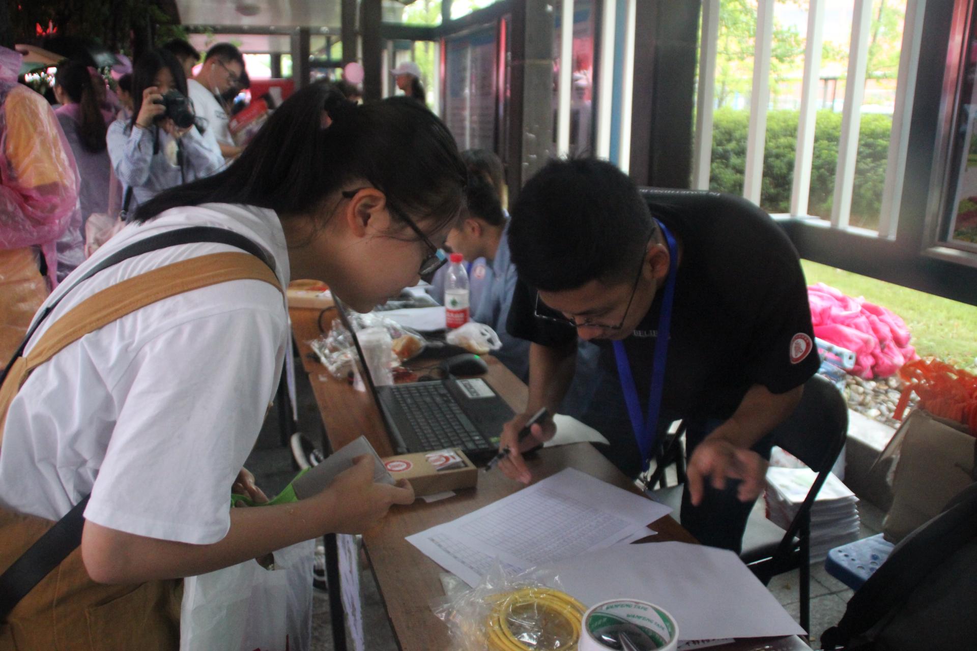报名点陆续迎来来自五湖四海的莘莘学子,尽管雨很大,但迎新工作仍然有条不紊的进行。