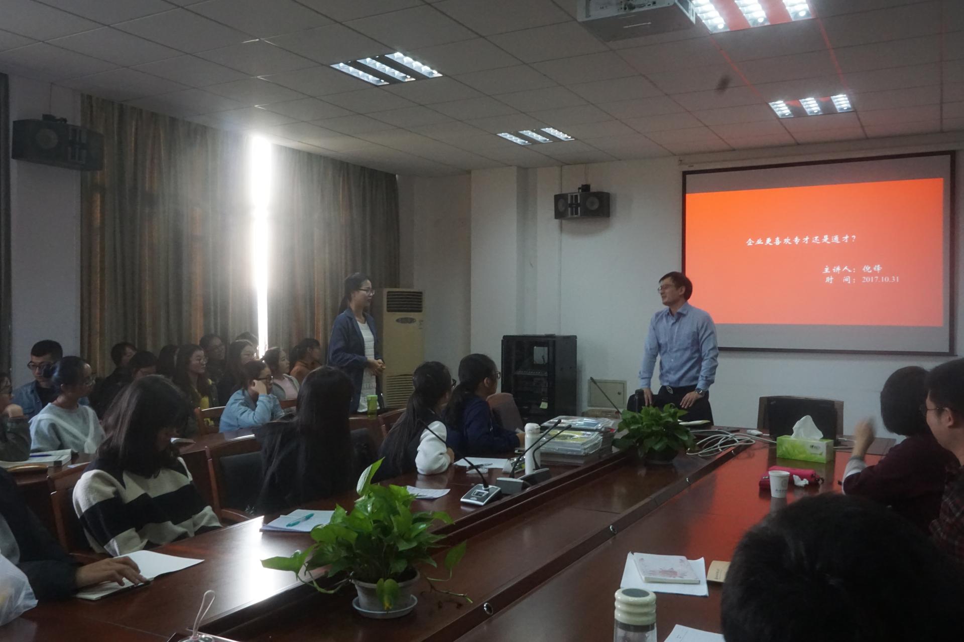 313教室举行。江苏明德玩具股份有限公司副总经理兼董事会秘书倪锋先生为17级国贸英华班本科新生和国际贸易与国际商务专业的研究生新生作了主题为“企业更喜欢专才还是通才”的讲座。