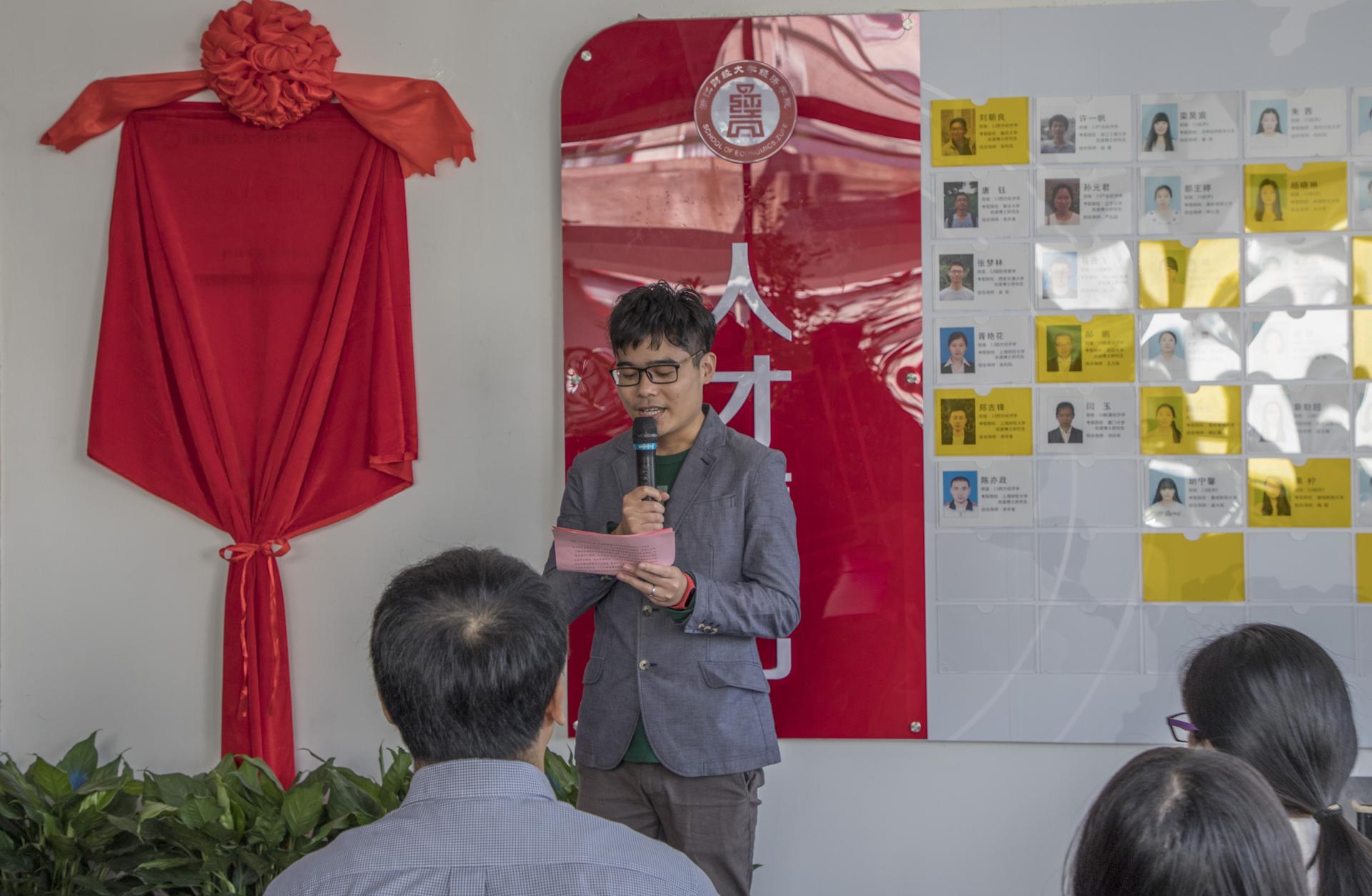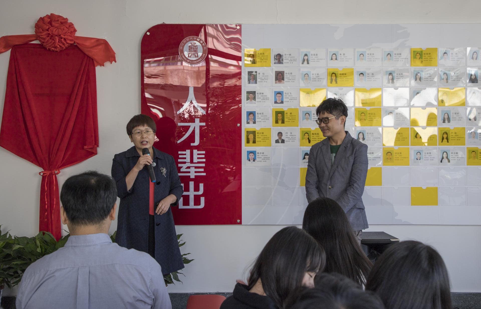 校友会会长金鑫、上海校友分会副会长余忠娜共同为学创中心揭幕。当红绸缓缓揭下,锃亮的牌匾展现在眼前,大家投以凝重肃穆的目光和热情的掌声,将这一历史性时刻铭记心间。
