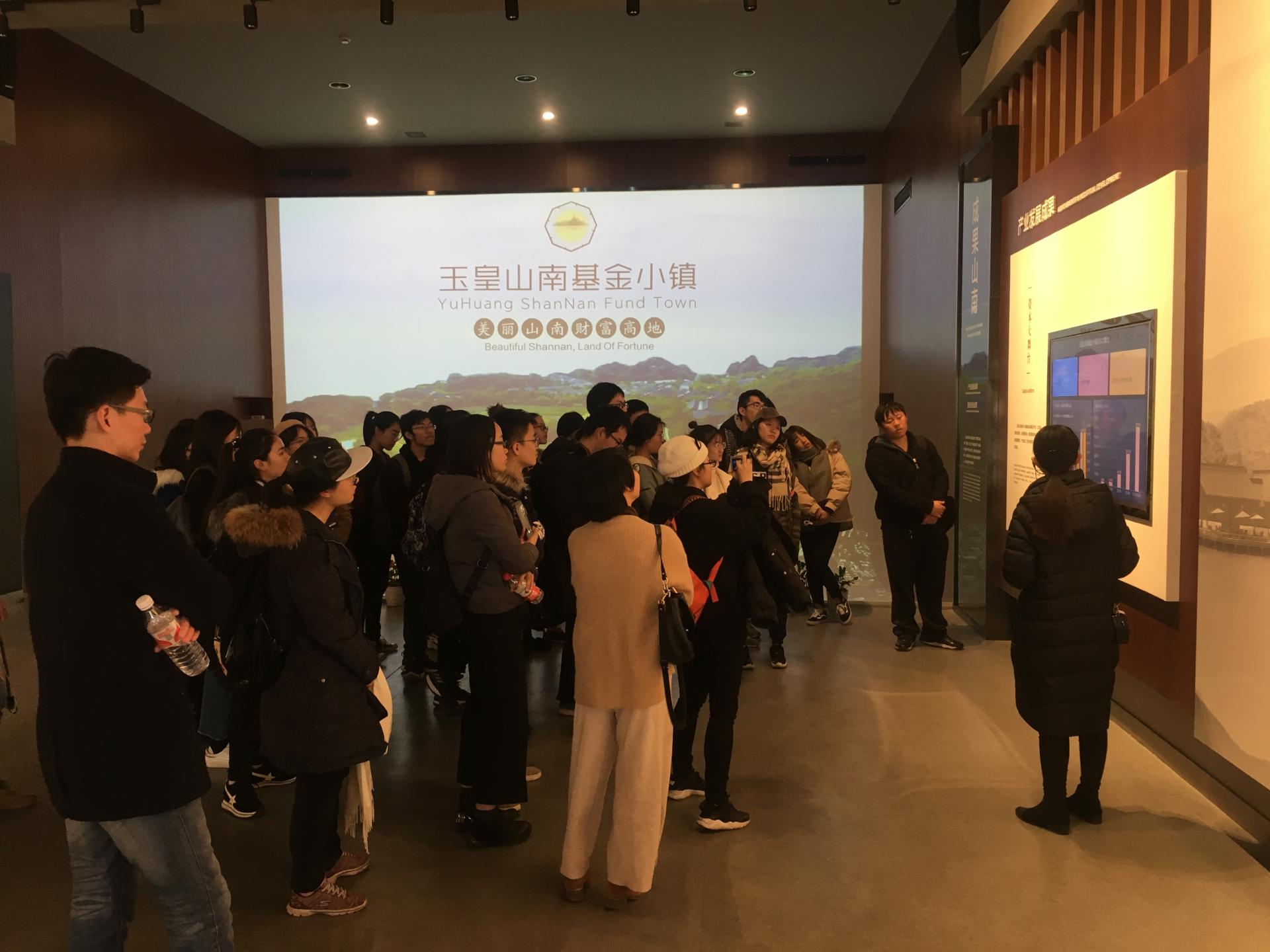 在二期展示馆内,工作人员为同学们讲述了小镇从起步建设到现在的拓展规划等相关情况,并详细介绍了小镇金融产业格局、运作管理、企业入驻、招商引资等情况。目前,小镇集聚了浙江赛伯乐、敦和资管、杭州联创等行业龙头企业等以及杭州湖畔山南资本管理有限公司、玉皇山对冲基金资管、永安国富资管等大型资管类企业共1000余家,资金管理规模超过5900亿元,实现税收10.77亿元。小镇如今的华丽蜕变,得益于省委、省政府“三改一拆”的决策部署,不搞大拆大建,依托得天独厚的自然环境和人文优势,大力推进玉皇山南区块旧住宅、旧厂房、旧仓库改造和拆违工作,实现了由过去简单的仓储加工业向文化创意产业,再向私募金融高端产业的成功转型升级。