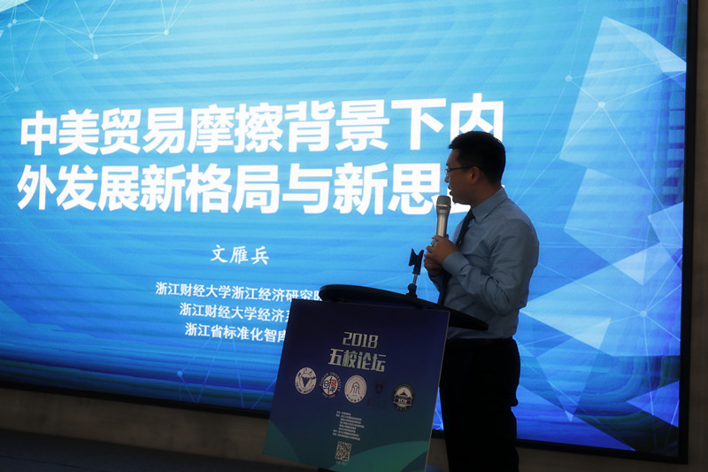 “2018国际贸易理论与中国现实问题五校论坛”主题为“贸易摩擦、经济大势与中国改革开放新态势”,共举行了改革开放策论、高端对话和论文研讨三个环节的学术交流和政策研讨活动。在改革开放策论环节,我校文雁兵副教授作了题为“中美贸易摩擦背景下内外发展新格局与新思路”主旨报告。在论文研讨环节,来自浙江大学国际经济研究所、复旦大学世界经济研究所、我校浙江经济研究院、南京大学国际贸易系、武汉大学世界经济系20余位青年学者和博士生报告了12篇国际贸易理论与应用领域的最新学术论文,我校沈鸿博士报告了题为《全球价值链嵌入位置与制造企业成本加成:贸易上游度视角的实证研究》一文,文雁兵副教授还与合作者报告了题为《国际标准认证与中国企业出口:理论与实证》一文。