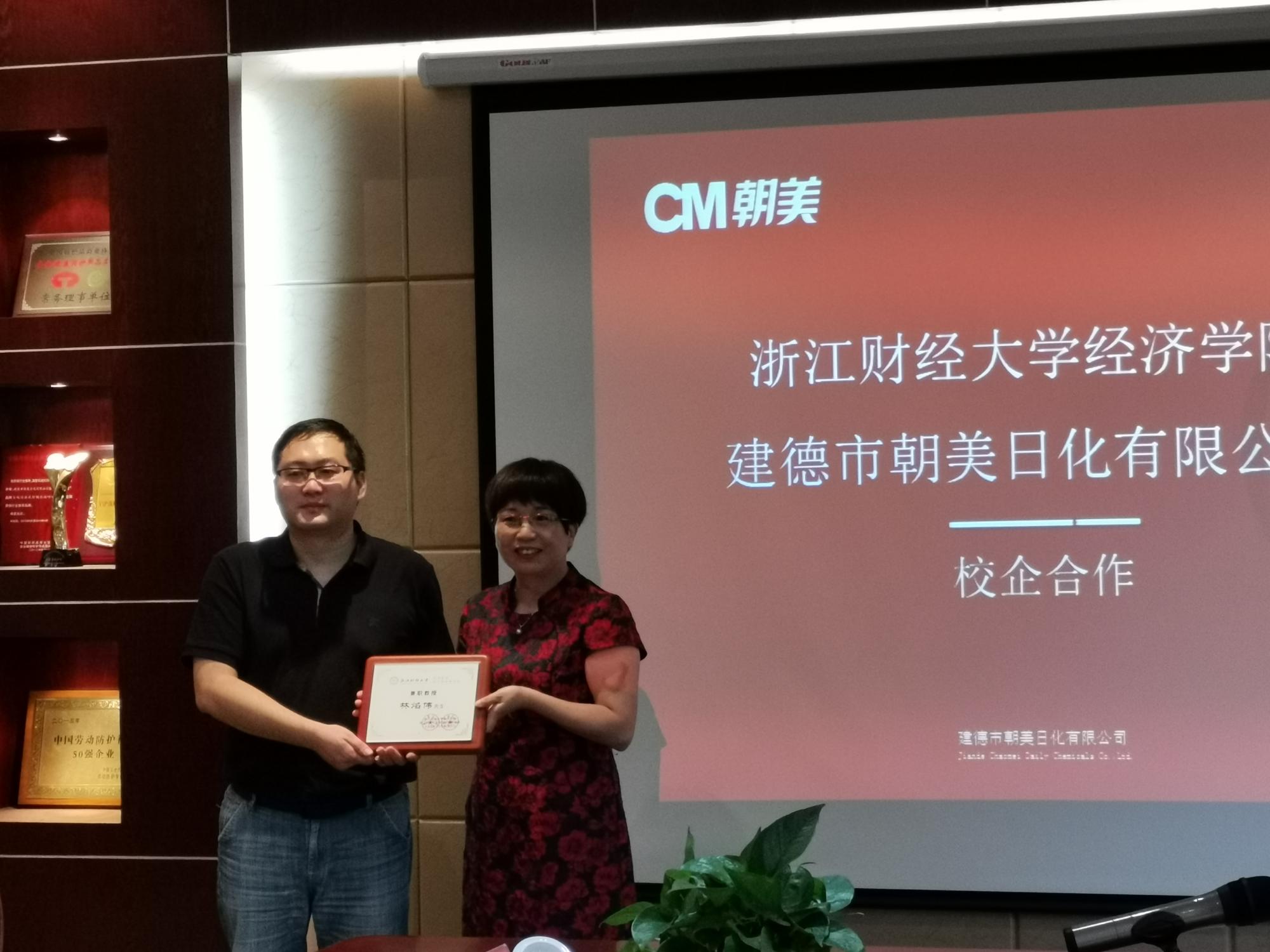 随后,胡亦琴院长为建德朝美日化总经理林焰伟颁发兼职教授和创业导师聘书,共同为“雷速体育app