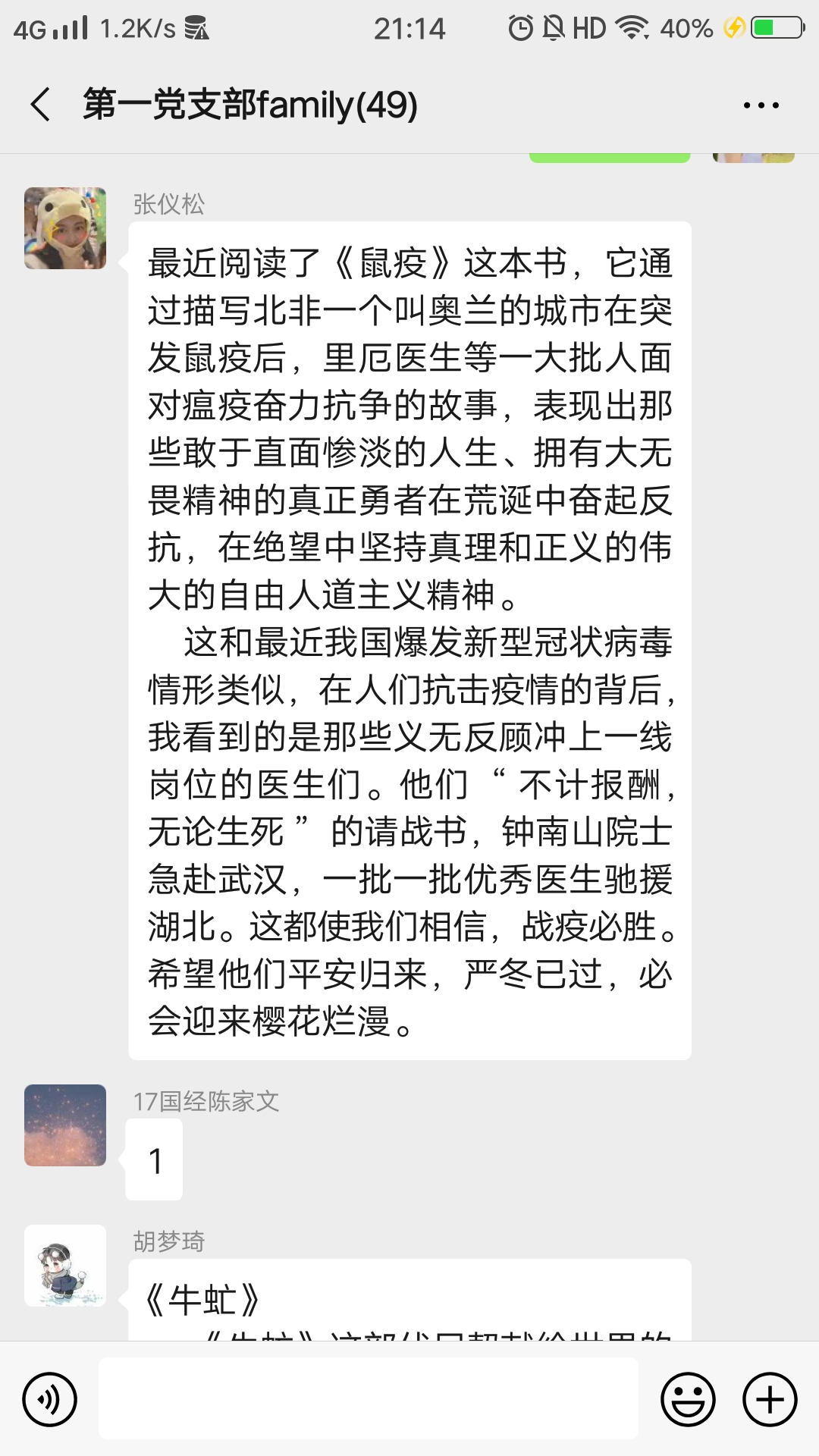本科生第三党支部在疫情发生后立刻行动,开展《就业季遭遇疫情,摆正就业心态》分享活动,分析当前国家就业形势,分享疫情当下正在开展线上招聘活动的相关信息,鼓励大家在特殊时期调整心态,利用网络资源,进行简历投递和线上面试,积极推进自身就业计划。本科生第一党支部结合支部“读书会”特色,全体党员针对疫情开展“云分享”,对《瘟疫与人》、《看见》、《鼠疫》等多部书籍进行分享。大家传达书中的精神内涵,进行反思和追问,探寻合理有效的解决办法,在疫情面前争做有理性、有思想、有作为的新时代大学生。在企业面临复工的情况下,研究生第一党支部以党小组为单位,发挥专业优势,围绕“企业复工”和“疫情防控”两个主题,针对“企业复工”的相关文件进行研究讨论,结合经济理论和疫情实际,分析目前多省复工的开展情况并交流想法。因疫情影响,今年研究生录取工作也有所延迟,本科生第五党支部抓住当前考研热点,在考研分数线公布后立即行动,联系采访了近年考取相应学校专业的学长学姐,以“前辈说”为主题为今年考研同学带来了复试准备攻略,整理后在支部书记曹仲晔老师公众号“辅导员摸摸头”上进行“云分享”,系列分享推送被1000余人浏览,受到同学们好评,并被兄弟院校转发分享。