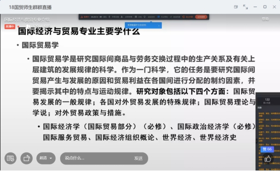 此外,吴宏老师还着重介绍了国际经济与贸易专业的学习内容,主要为国际贸易学、国际贸易实务、国际金融与跨境电子商务,并对其中设置的相应课程进行了详细说明。