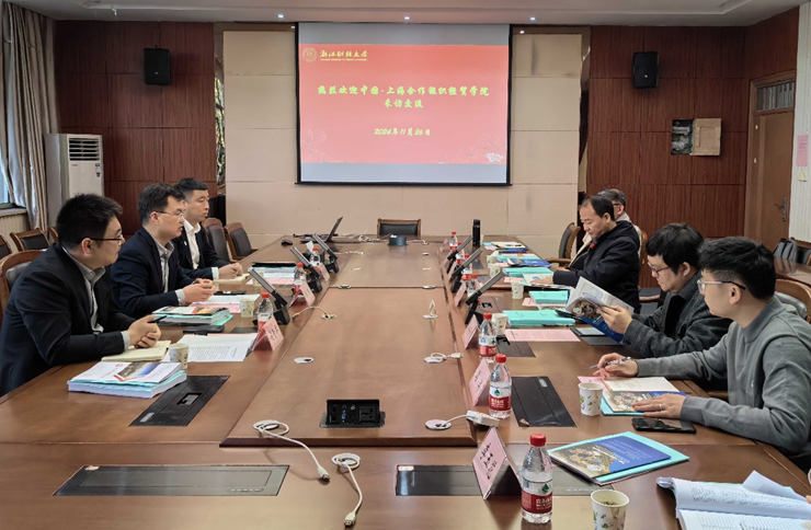 一行首先参观浙江财经大学中亚研究院,院长余慕鸿与国贸系教师代表一同陪同交流,余院长向郑院长一行介绍了中亚研究院主要成果、研究工作,双方开展了深入交谈。
