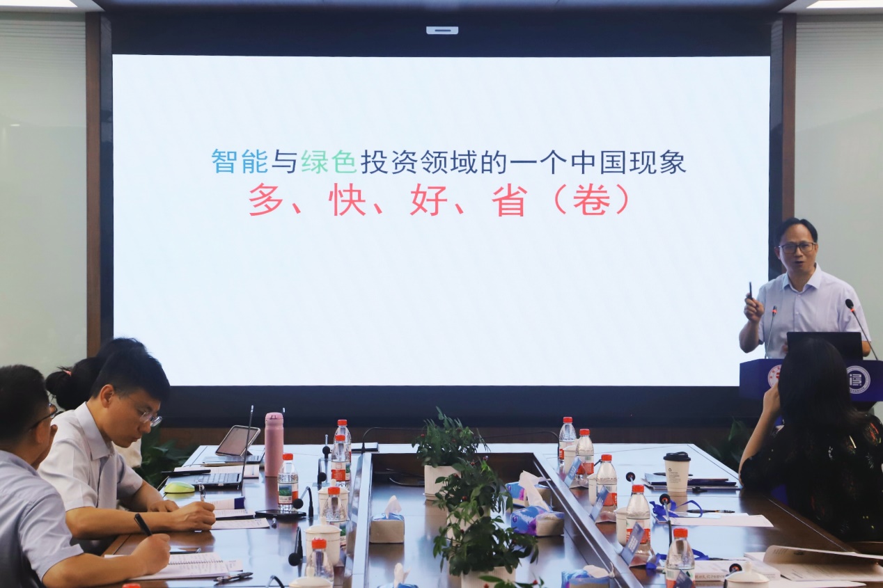 潘毅刚教授作“对产业投资趋势和政策取向的观察思考——迈向智能文明与生态文明耦合时代的抉择”报告。他通过对我国新能源汽车这一现象级热点投资的观察,引出“十五五”产业投资促进政策制定的三点思考:一是从硬投资为主向软投资兼顾转型,投资于人;二是从选择性政策向功能性政策转型,投资于效;三是从单一政策支持向综合施策治理转型,投资于融合。