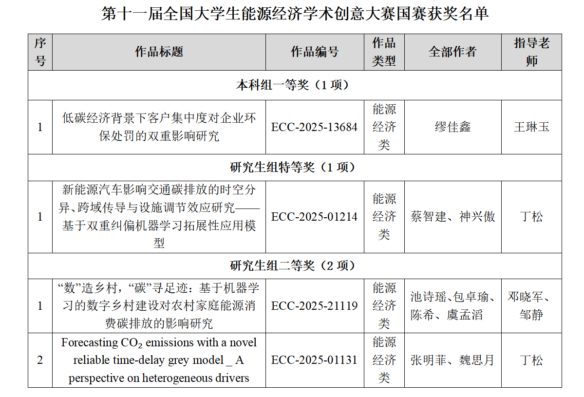 近日,第十一届全国大学生能源经济学术创意大赛总决赛在山西财经大学成功举办。本届大赛组委会共收到来自全国724所高校的31388支队伍报名参赛,报名参赛学生人数超过82000人,指导教师人数达到超过33000人。大赛分为校赛、区域赛、国赛三级赛事,最终26个赛区共推荐入围国赛作品1613项。经评审,大学生组114项作品进入全国总决赛(34项作品经决赛比拼获得特等奖,80项作品获得一等奖),133项作品获得二等奖,220项作品获得三等奖;研究生组74项作品进入全国总决赛(21项作品经决赛比拼获得特等奖,53项作品获得一等奖),73项作品获得二等奖,119项作品获得三等奖。