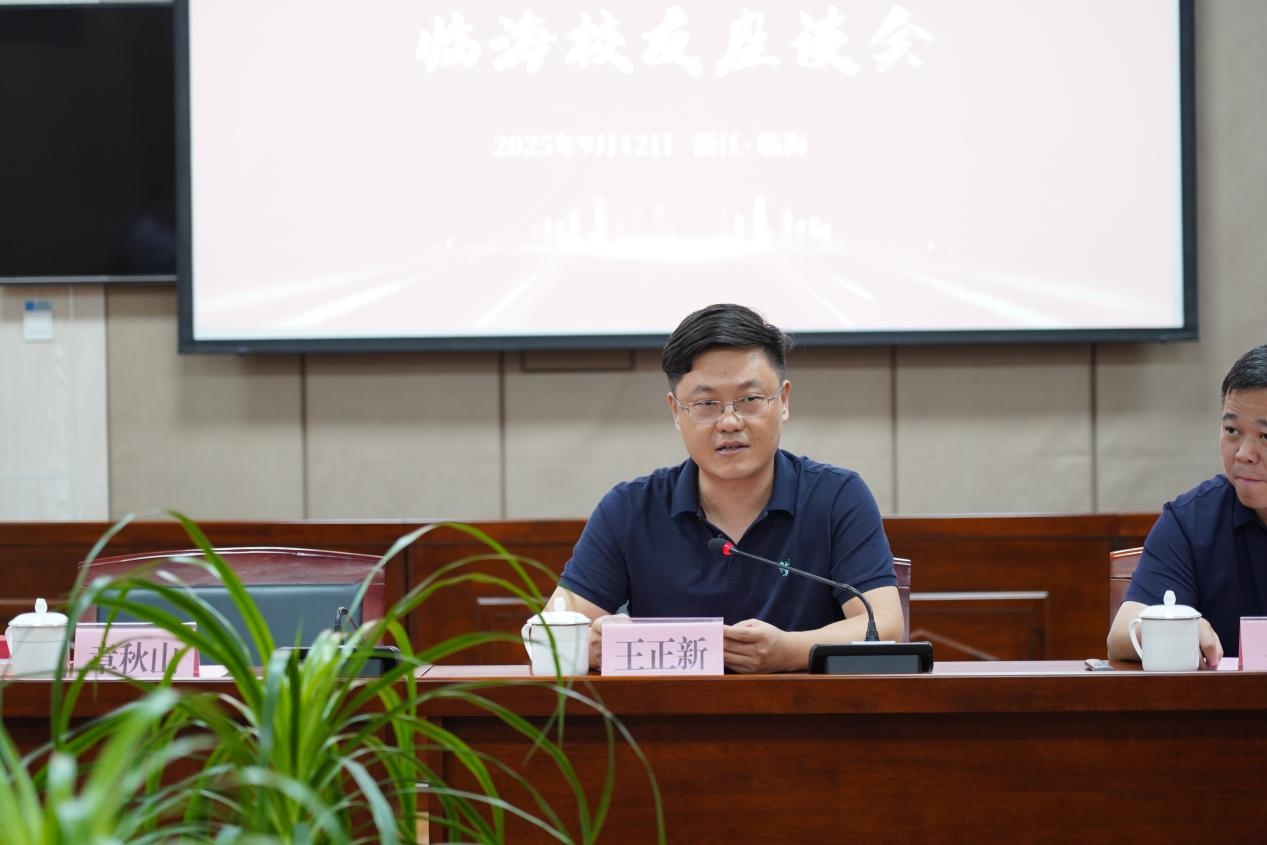 校宣传部部长王正新代表学校向校友致以诚挚问候,对广大校友长期以来给予学校事业发展的关心与支持表示衷心感谢,王正新系统介绍了母校近年来在学科建设、人才培养、校园发展等方面的重要成果,包括成功入选省高水平大学建设高校、应用经济学跻身省登峰学科、新增 2 个一级学科博士点、正式获得硕士推免资格等,充分肯定了临海税务系统校友扎根岗位、精准落实税收政策、服务地方发展的责任担当。同时解读学校 “使命文化大讨论”活动背景 及 “财经 × 数智”“财经 × 科技”“财经 + 产业” 人才培养改革方向,诚挚邀请校友结合行业实践建言献策,共同推动学校文化建设与人才培养质量提升。