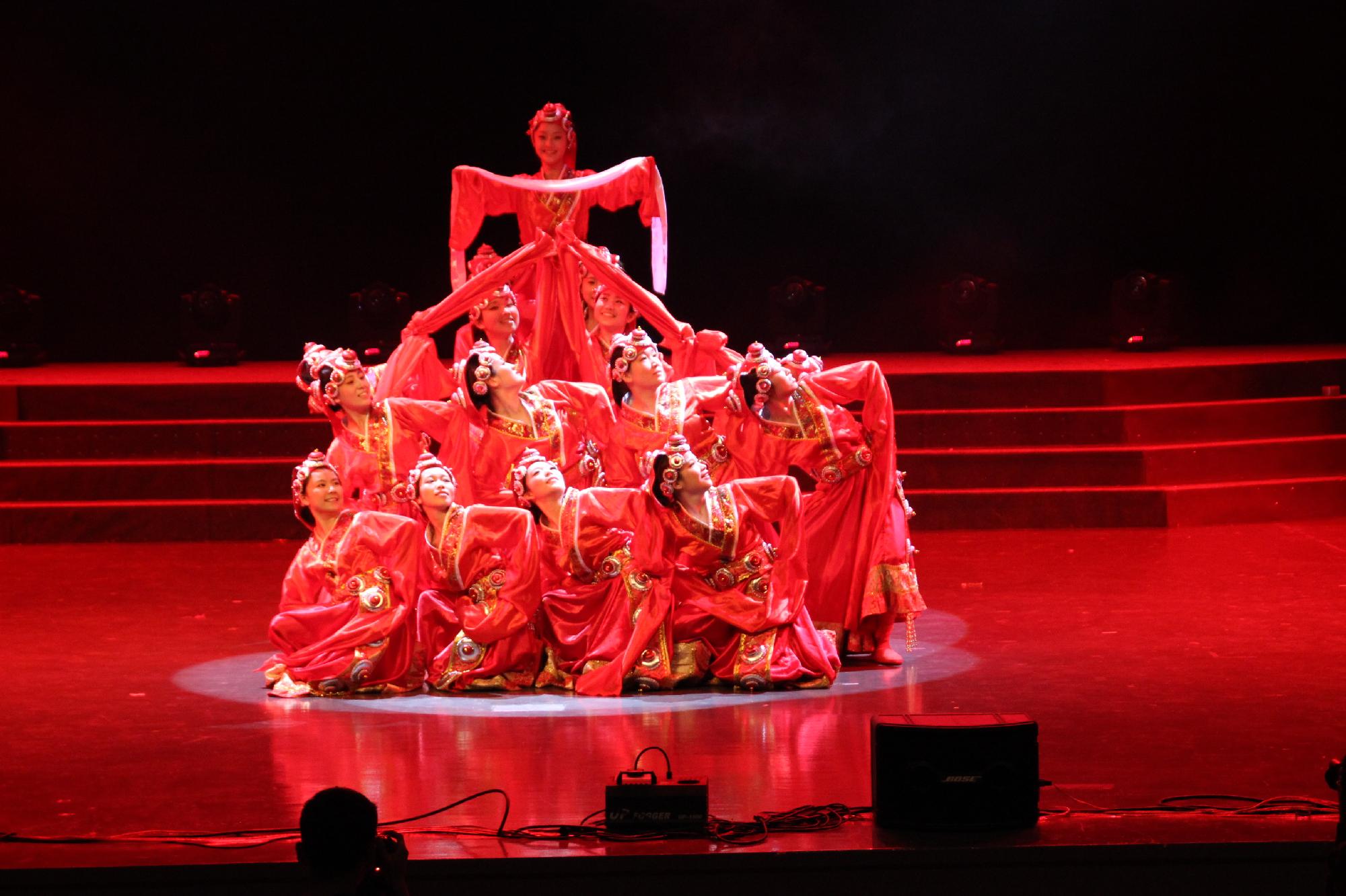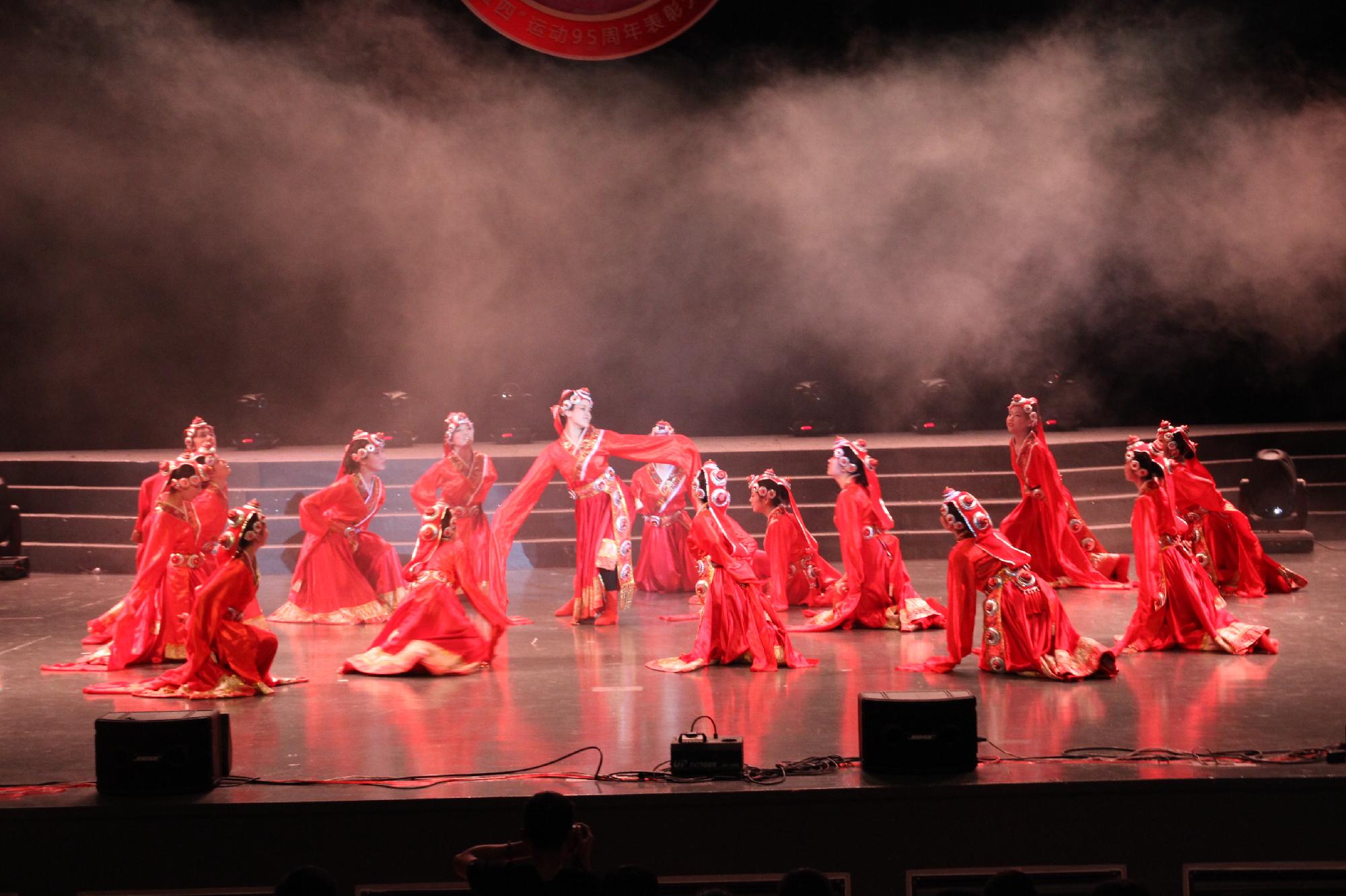 带来了别具一格的藏族舞蹈《心声》。青春洋溢的舞者们一席火红的藏袍,伴着独特的藏族音乐旋转舞动,火红的裙摆旋转出火的跃动,火红的水袖甩出一片青春的色彩,与舞台的布景相映成趣,昭示着火红的五月精神。音乐由缓转急,一幅浩瀚如民族史诗般的画卷徐徐展开,渐渐的,舞者的一举手一投足已经看不分明,水袖的翻动裙摆的旋转在视野中逐渐远去,而只剩下那一片跃动的火光,仍执着的舞动着摇曳着,生生不息——这或许就是舞蹈《心声》的真正含义所在,藏汉人民的深厚友谊,不变的五四精神,在代代相承中,永不褪去的火红本色,生生不息。
