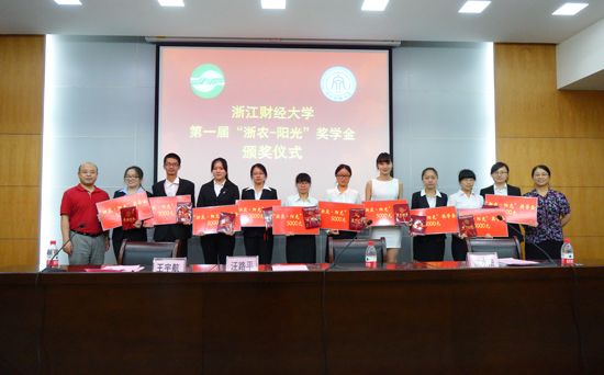 6月13日上午,我校举行浙江财经大学第一届“浙农—阳光”奖学金颁奖仪式。经层层展示评比,雷速体育投注 12级区域经济学专业研究生张燕和11级国贸1班本科生冯瑶瑶在20位候选人中脱颖而出,荣获第一届“浙农—阳光”奖学金,校党委副书记王宇航为其颁发了奖学金和荣誉证书。