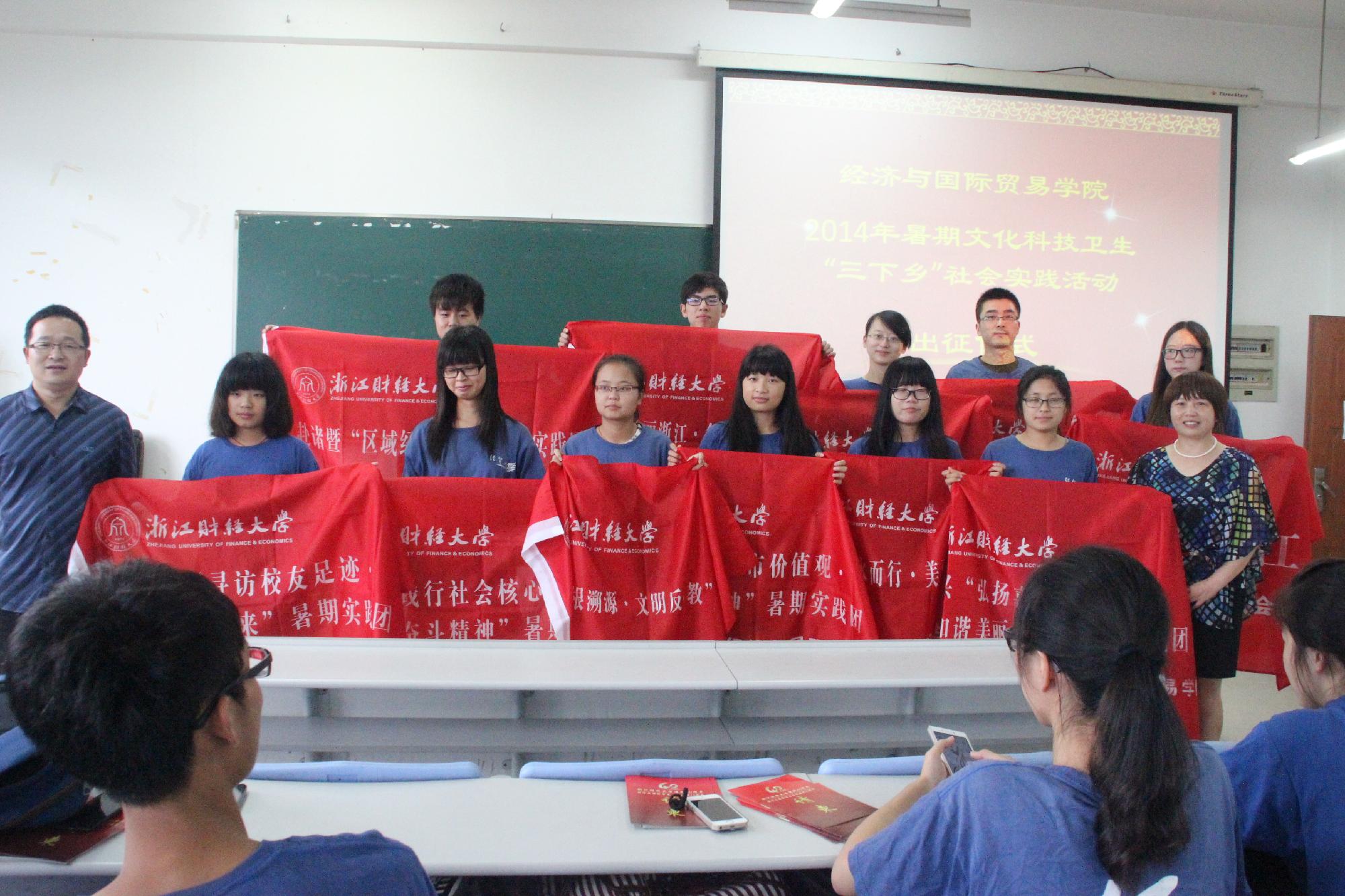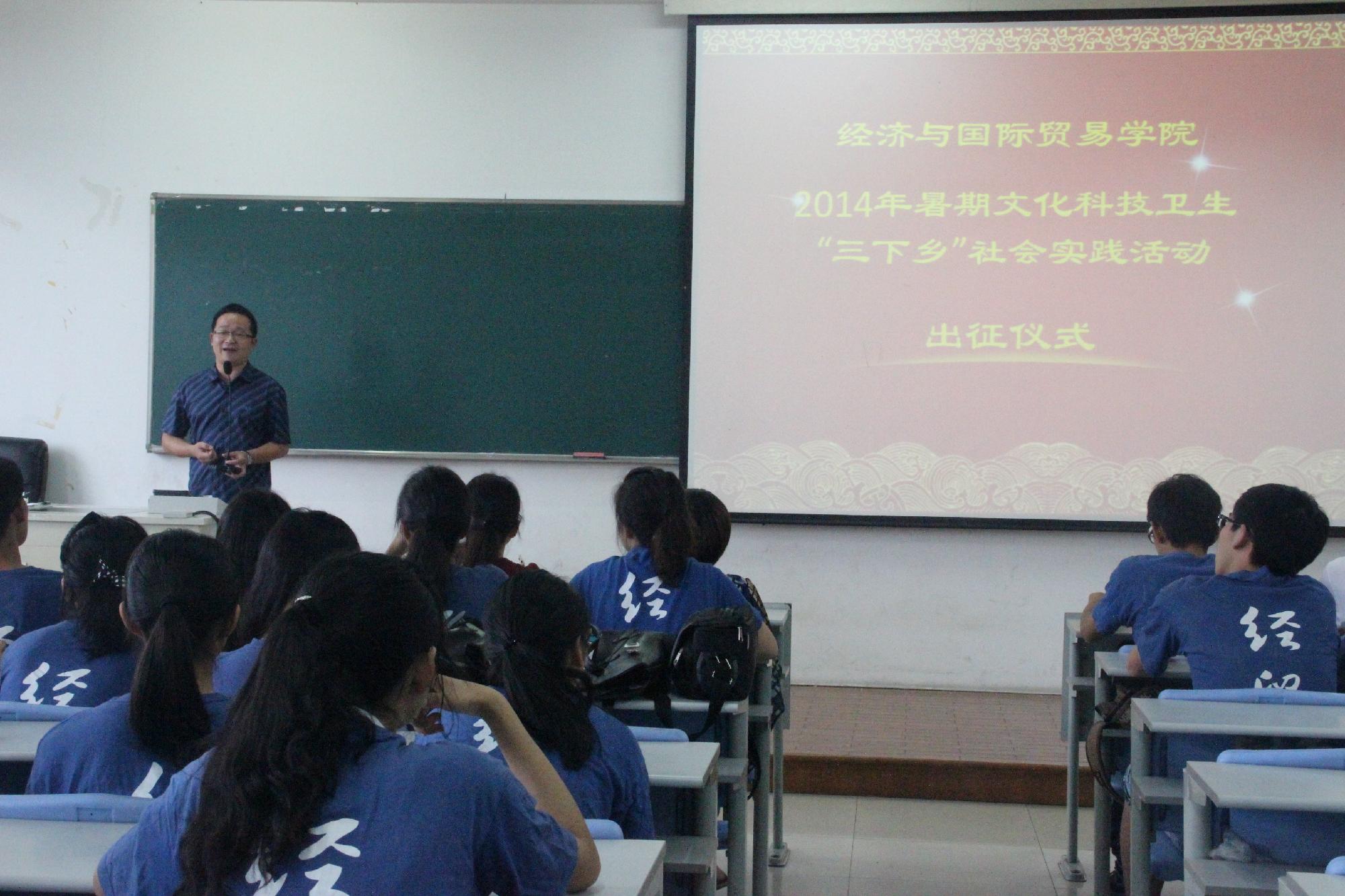 楼105教室举行了“2014年暑期文化科技卫生‘三下乡’社会实践活动出征仪式”。院长胡亦琴、党总支书记范建锋、党总支副书记叶秀、带队老师及全体实践团成员出席了仪式。