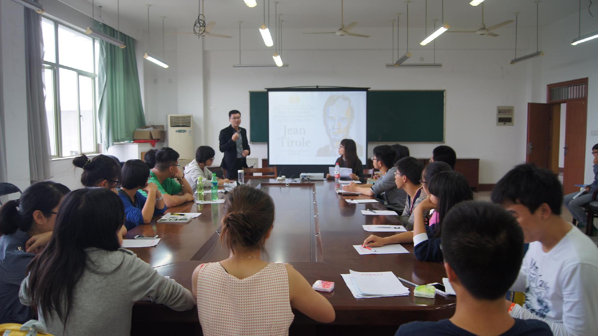 2014年10月6日诺贝尔经济学奖颁发,这件事受到了众多经济学人的关注。在这之前,经济学会就今年的诺贝尔经济学奖最终花落谁家进行了竞猜,众多同学与老师参与其中。揭晓让·梯若尔为诺贝尔经济学奖得主后,10月22日下午,在文雁兵老师的带领下,经济学会举办了“谁动了我的诺贝尔之走进获奖者”的学术探讨会。文老师首先为大家简单介绍了诺贝尔奖项设置及评选历史,接下来详细讲述这位公认的“天才”经济学大师让·梯若尔的获奖原因以及他的研究领域和对社会的贡献等等方面。在文老师的逐步引导下,同学们也就让·梯若尔的种种事迹进行了热烈讨论。