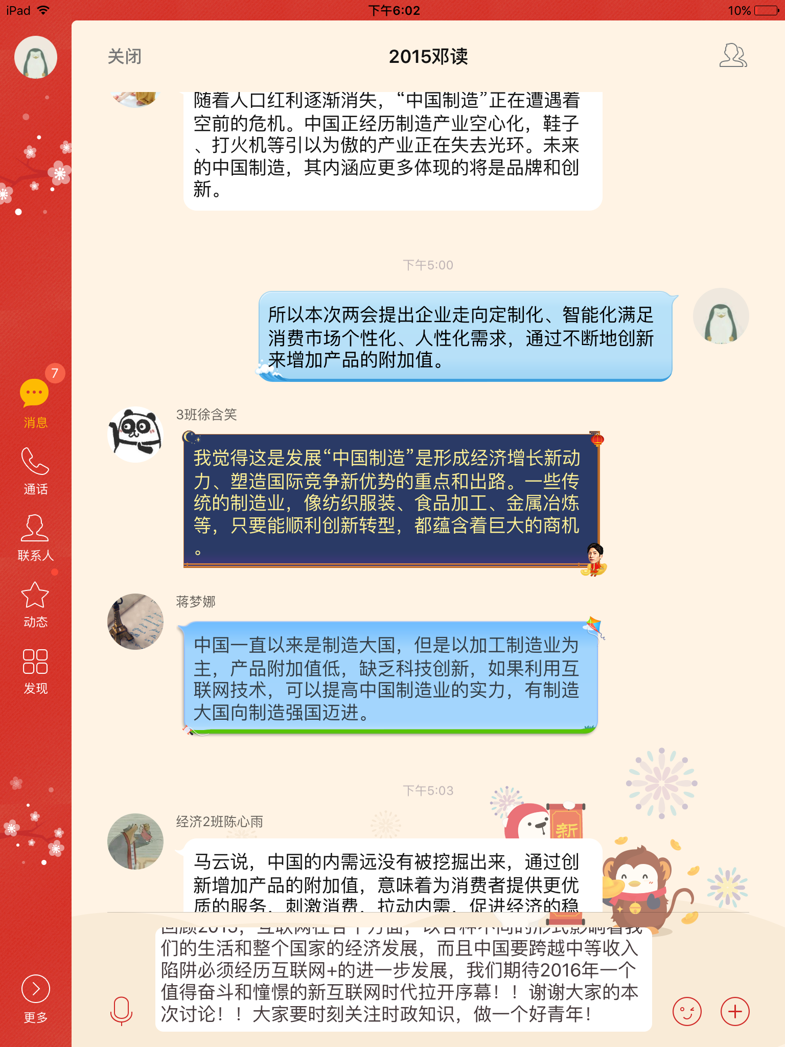 各支部,各班及社团邓读对两会相关热点问题进行了热烈的线上讨论,同学们积极参与,通过QQ群,微信群对就业、高等教育、创新创业、民生等问题进行了交流。其中,第二党支部对两会中“大众创业,万众创新”的话题进行了讨论,指出拥有了众创的平台才能使创新意识和作品有更好的展现空间,也对学校建设创新创业型大学,进一步培养学生创新意识表示支持。第三党支部重点关注了两会中与杭州相关的一些话题,如杭州医改政策,杭州发展模式和G20峰会等,从身边热点出发,具有敏锐的洞察力。研究生第一党支部凭借专业知识对供给侧改革进行热议。在各班讨论中,14经济一班查询了中青舆情检测室检测两会相关信息的数据,显示出国民对两会的关注热度。15国民经济的同学对两会中的“中等收入陷阱”提出了自己的意见。邓小平理论读书协会重点关注了两会中的“中国制造+互联网”,指出通过产品创新走向“中国智造”。