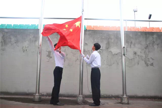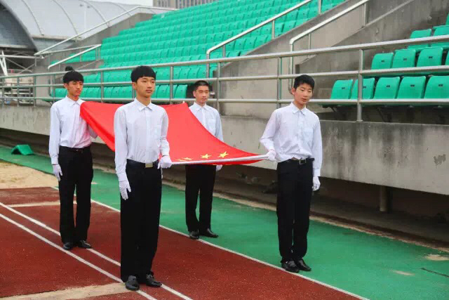 早上7点30分,主持人宣布升旗仪式开始,四位护旗手身着白色衬衣,英姿飒爽,迈着铿锵有力的步伐走向升旗台,全场一片肃静,伴随着雄壮的《义勇军进行曲》,鲜艳的五星红旗冉冉升起,全体同学行注目礼,齐唱国歌。