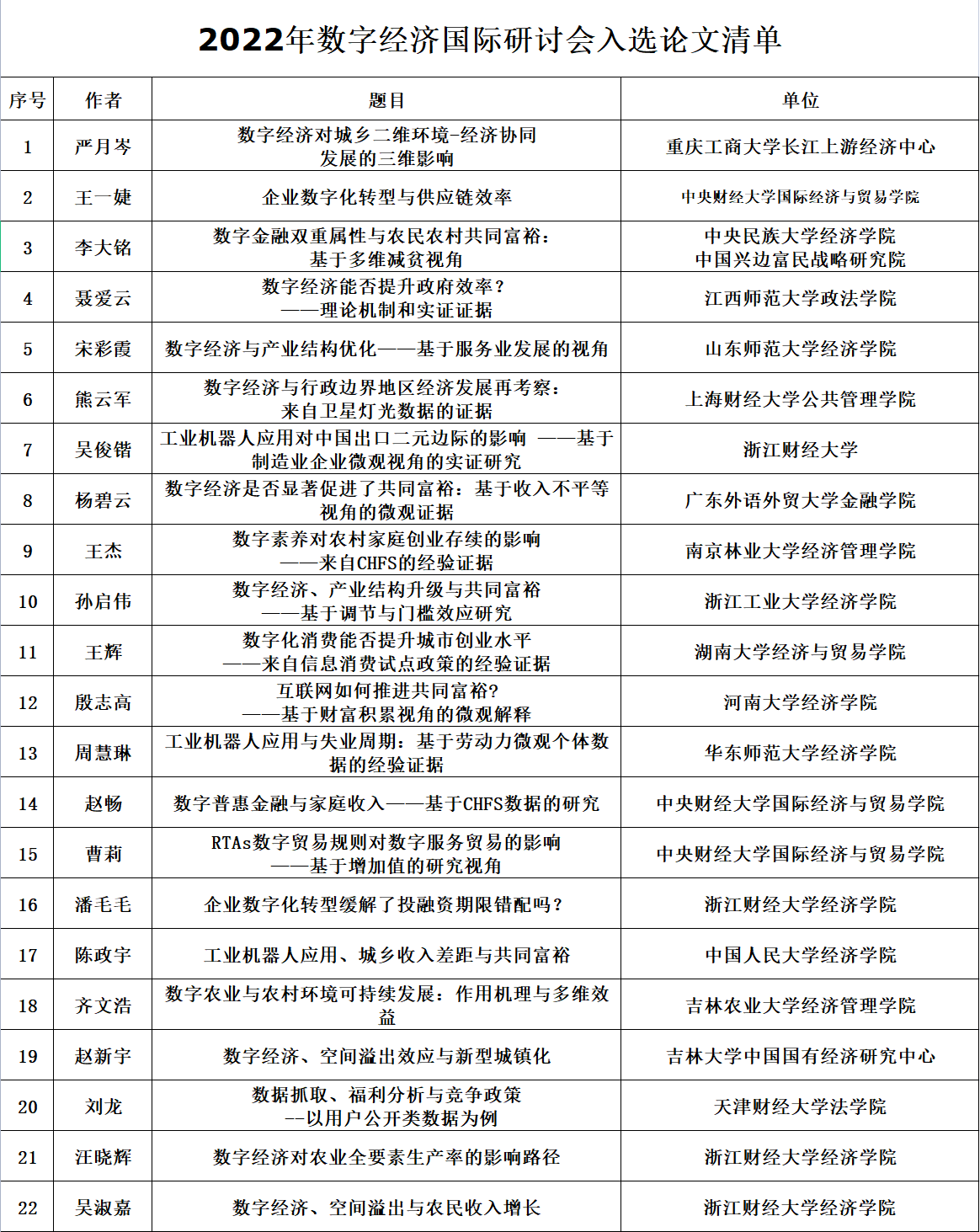 经2022年数字经济国际研讨会▪数字经济与共同富裕论坛学术委员会匿名评审,共计22篇论文入选本届论坛,清单详见附表。入选论文将由作者在12月25日下午举行的平行论坛(线上)报告并接受专家现场点评,论坛优秀论文将推荐给论坛协办期刊优先评审录用。