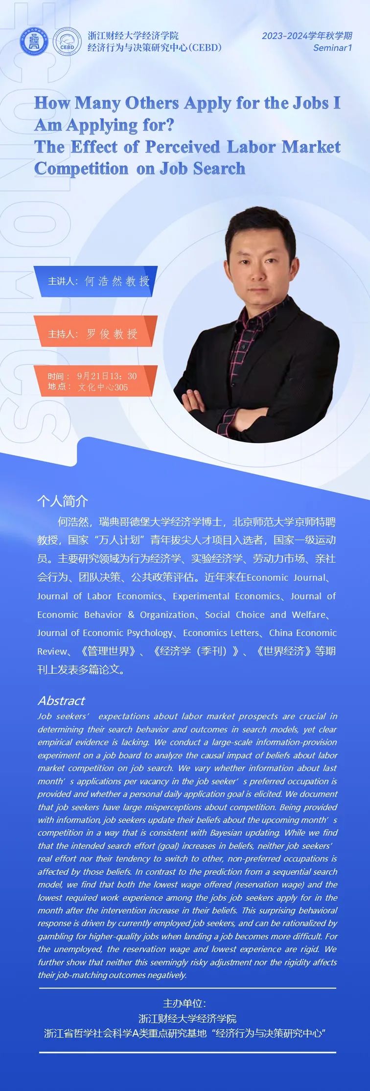 何浩然,瑞典哥德堡大学经济学博士,北京师范大学京师特聘教授,国家“万人计划”青年拔尖人才项目入选者,国家一级运动员。主要研究领域为行为经济学、实验经济学、劳动力市场、亲社会行为、团队决策、公共政策评估。近年来在Economic Journal、Journal of Labor Economics、Experimental Economics、Journal of Economic Behavior & Organization、Social Choice and Welfare、Journal of Economic Psychology、Economics Letters、China Economic Review、《管理世界》、《经济学(季刊)》、《世界经济》等期刊上发表多篇论文。