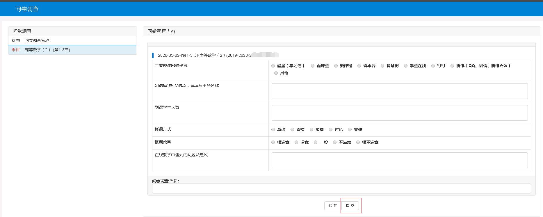 1、教师根据教学大纲要求做好备课和授课工作。由于受疫情影响,本学期初采用在线授课的方式,因此教学检查改为由教师和学生各自反馈。教师教学反馈操作方法如下:每次课结束后教师登录教务系统反馈授课情况(当日完成),教务处将根据教师填写的数据于次日汇总上报教育厅。操作路径:教务系统——教学评价——问卷调查。