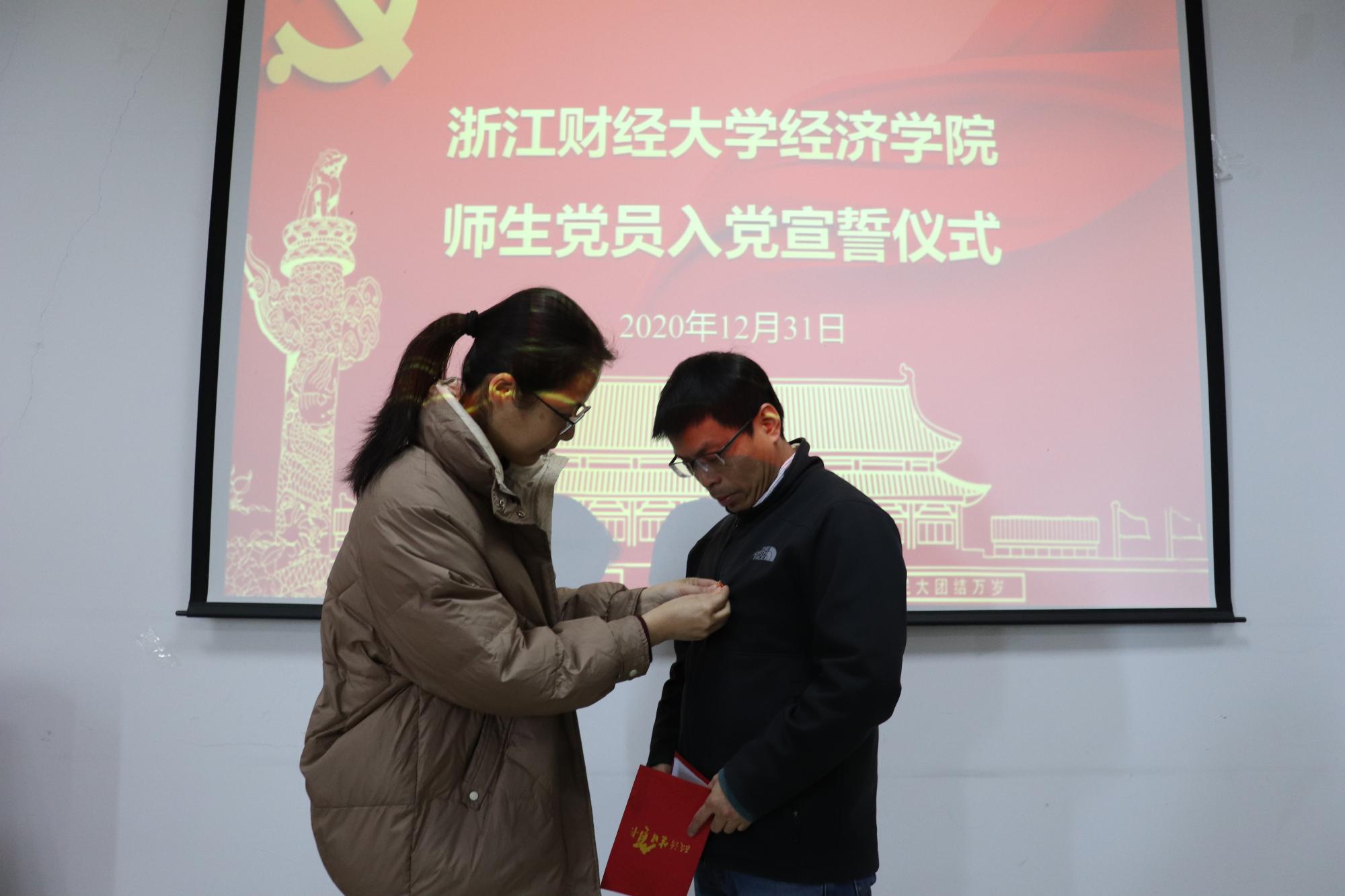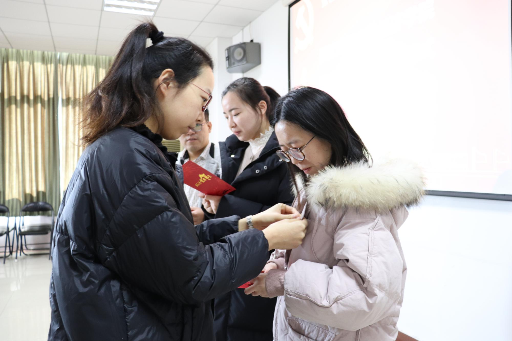 党委书记胡亦琴、各支部书记为新发展党员佩戴党徽,赠送政治生日贺卡与党员笔记本,希望大家永葆政治初心,牢记时代使命。在胡亦琴书记的带领下,全体新发展党员面向鲜艳的党旗,举起右拳,庄严宣誓,铮铮誓言,铿锵有力。