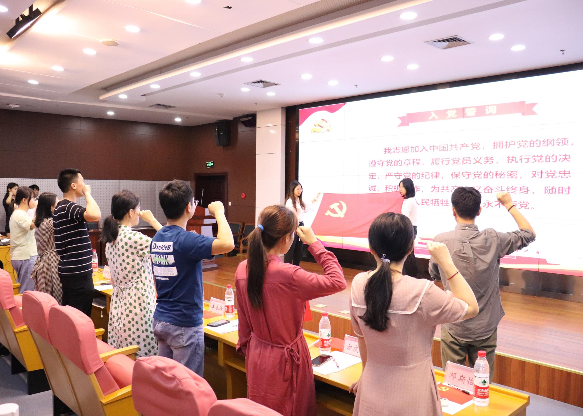 入党宣誓仪式是对预备党员进行培养教育的一个重要环节。各支部书记为新发展预备党员代表佩戴党徽,分发党章及党史书,希望新党员们能够永葆政治初心,牢记时代使命。在崔泰铭老师的带领下,全体新发展党员面向党旗,举起右拳,庄严宣誓,一字一句,字字铿锵。最后,宣誓仪式在全体师生合唱《没有共产党就没有新中国》的歌声中落下帷幕。