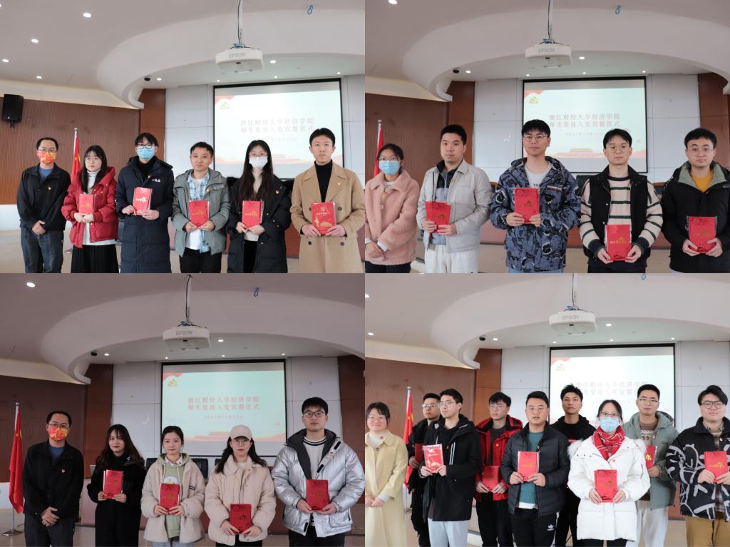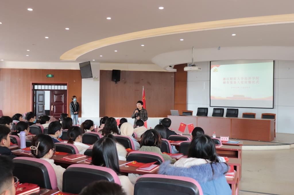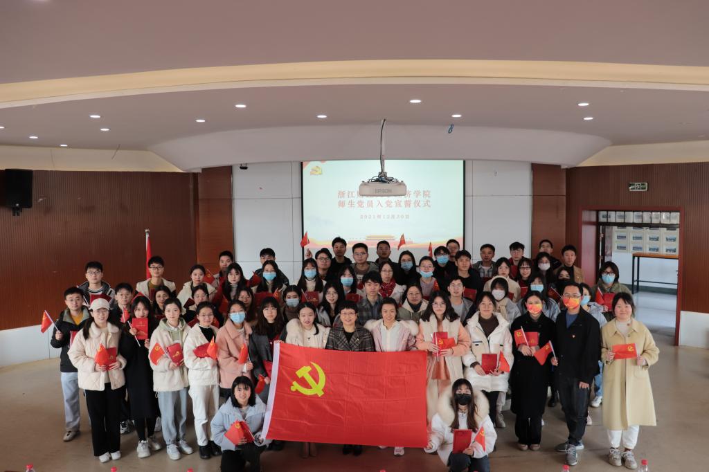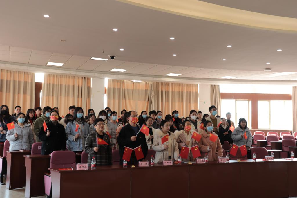 党委书记胡亦琴、各支部书记为新发展党员佩戴党徽,赠送政治生日贺卡与党员笔记本,并在胡书记的带领下,52名预备党员面向党旗,庄严宣誓,一字一句,字字铿锵,表达了对党的忠诚和为共产主义事业奋斗终身的决心。宣誓结束后,全体师生党员齐声歌唱《没有共产党就没有新中国》,用歌声颂扬党恩。