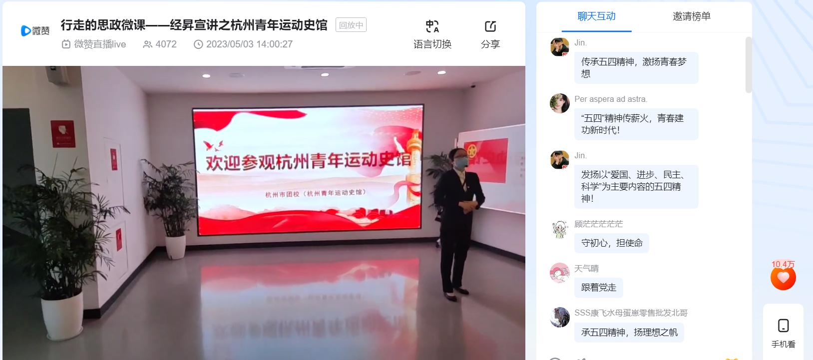 “经昇”宣讲团前往杭州青年运动史馆开展“行走的思政课”,通过线上直播的方式将宣讲内容传播给在校师生,在线学习人数达到四千余人。