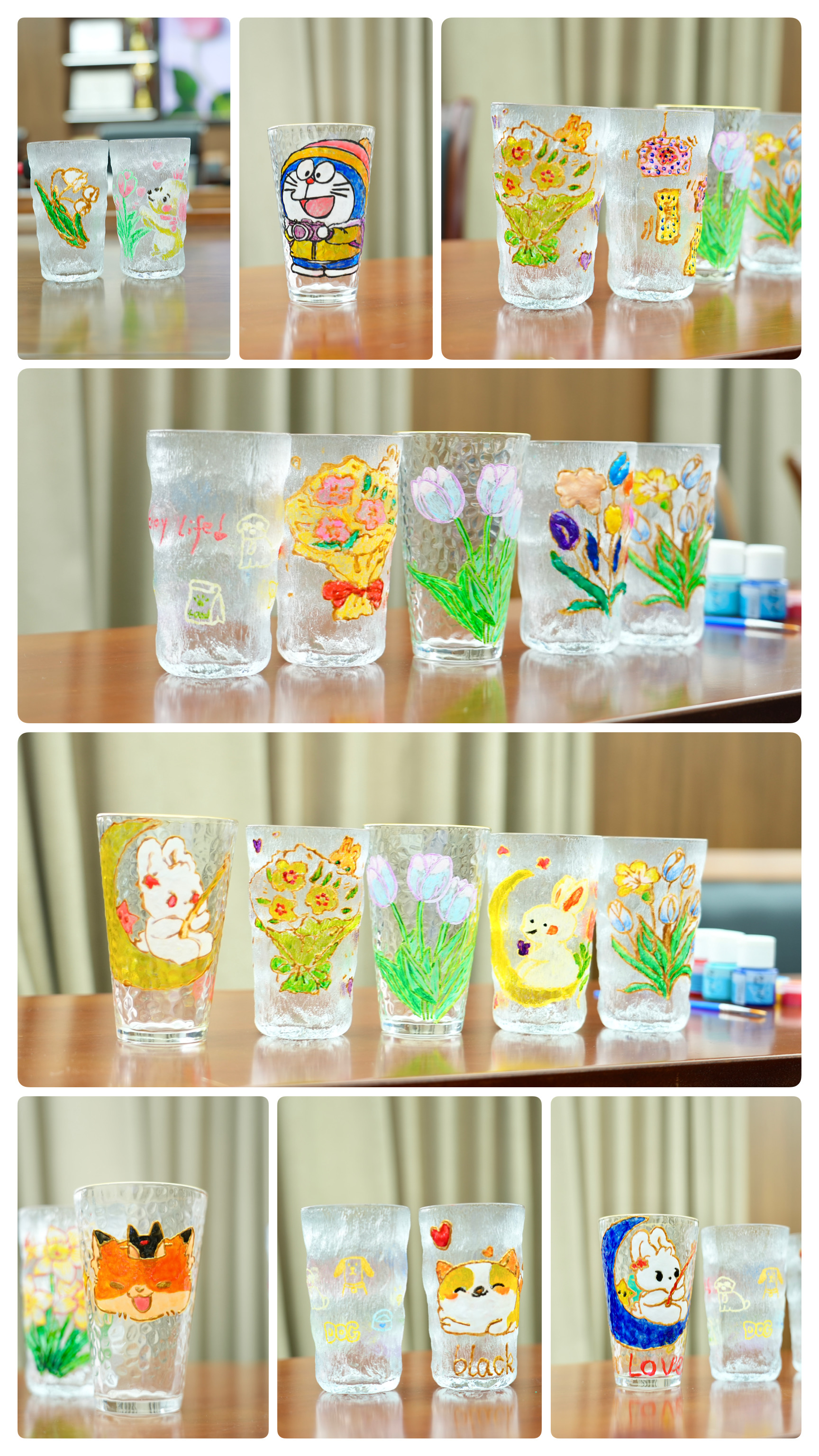 在手工老师的细心讲解下,大家首先用勾线笔勾勒出图案轮廓,随后用水彩笔为图案填色。整个过程充满了创意与乐趣,老师们纷纷发挥自己的艺术天赋,绘制出独具特色的玻璃杯作品。最后,经过烘干处理,一个个精美的手绘玻璃杯呈现在大家眼前。