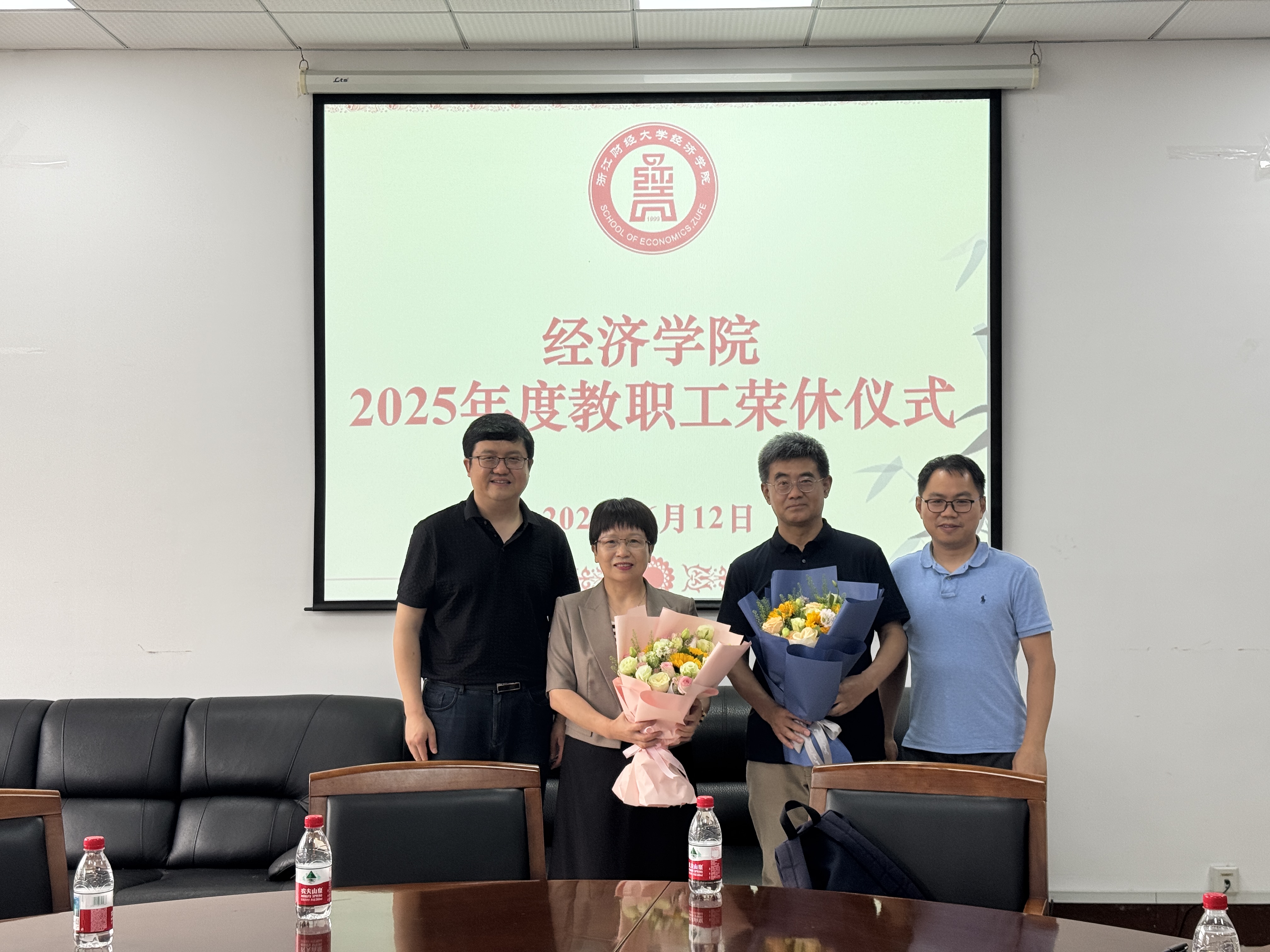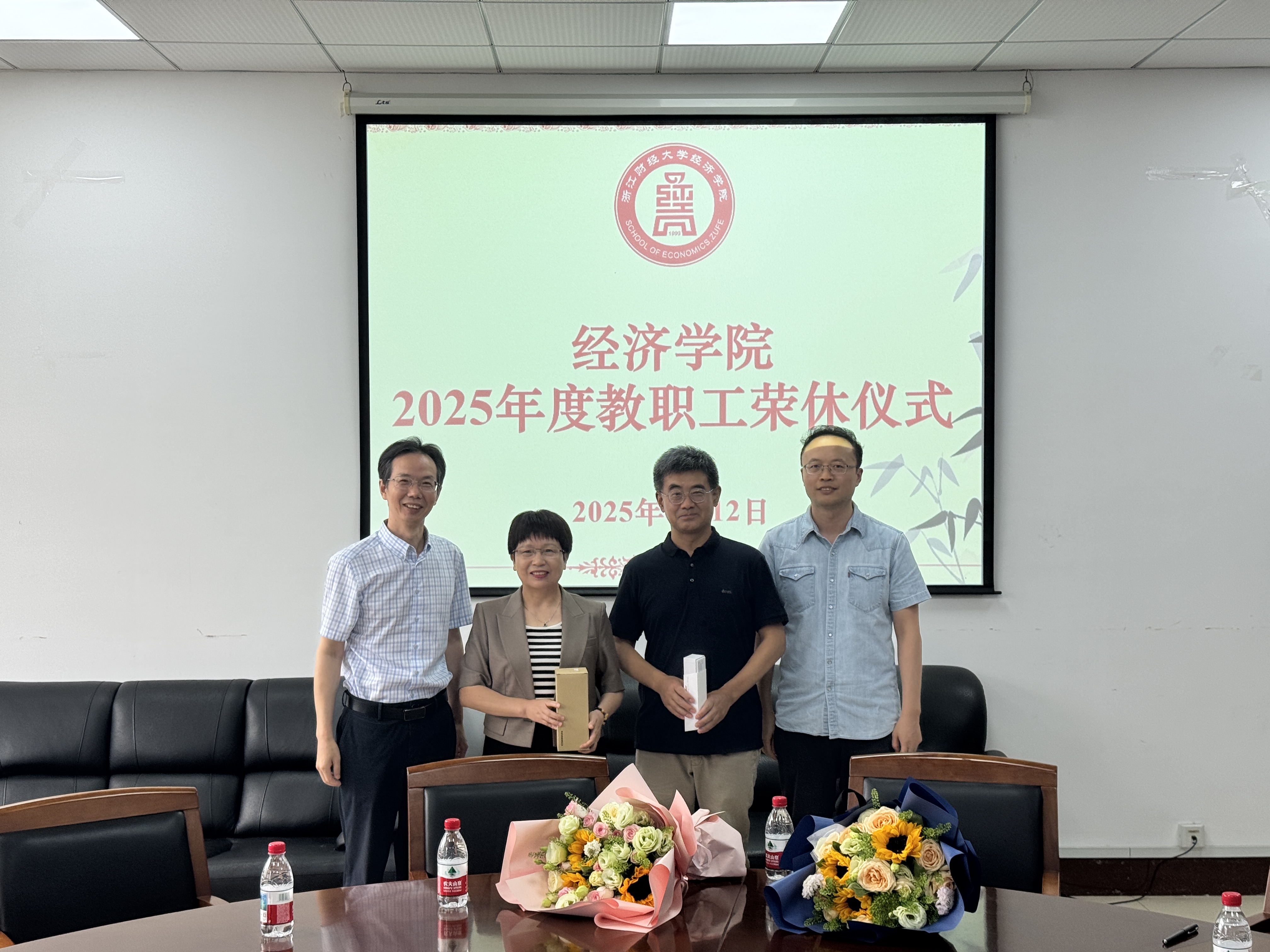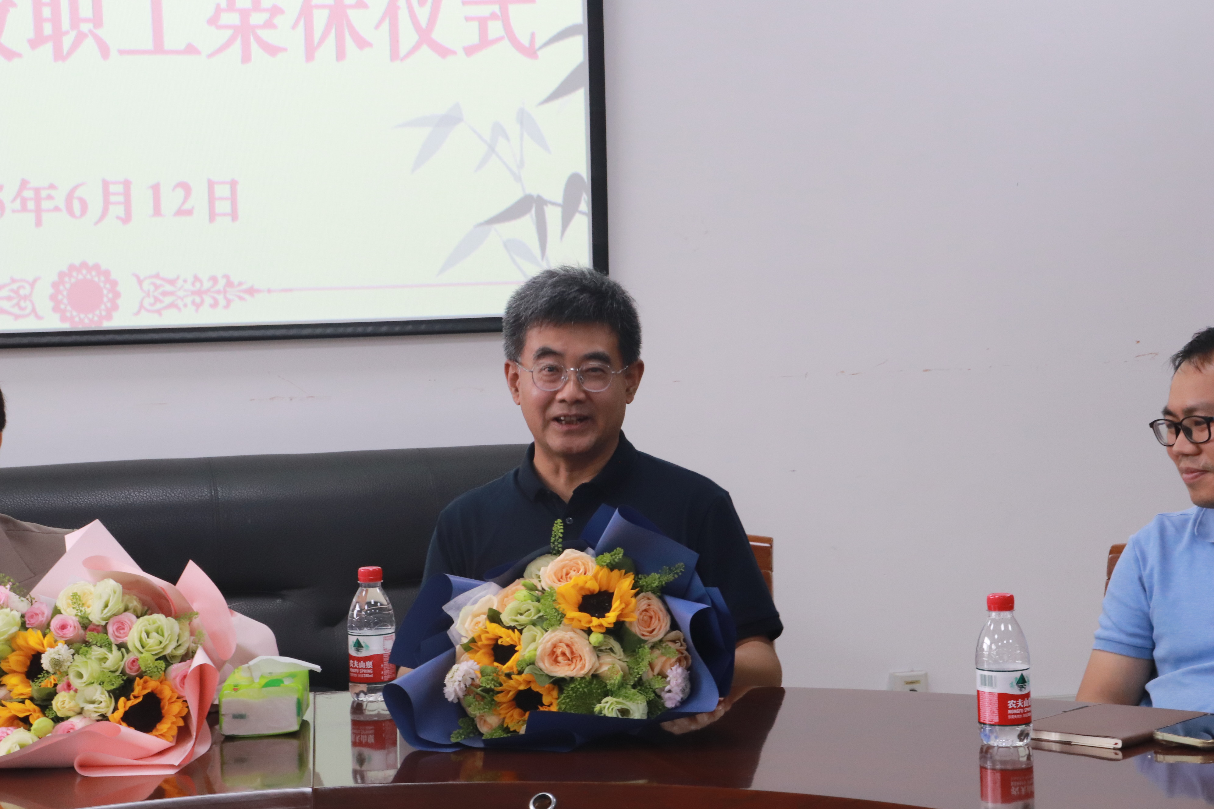 仪式上,雷速体育app 院长罗俊和雷速体育app 党委书记徐奇伟为胡亦琴老师、严北战老师颁发了荣休纪念品,并献上鲜花,与两位老师合影留念,定格这一珍贵瞬间。