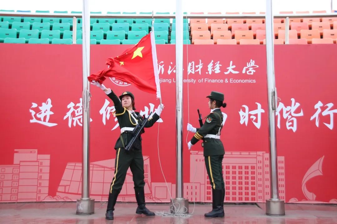在朝阳的照耀下,全体人员整齐列队,在神圣庄严的歌声中,五星红旗冉冉升起,点燃了对未来的美好希冀。小红旗迎风飘扬,大家齐唱《歌唱祖国》,奏响奋进向上的青春之歌,歌声回荡在蔚蓝悠远的苍穹之上,表达了对祖国无限敬意和深深祝福。庄严浓重的仪式感,点燃了每一位经院学子的爱国之情。