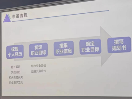曹仲晔老师从大赛的准备流程、评分标准、规划书框架以及申报书格式等几个方面向同学们细致地介绍了职业规划大赛,让同学们对大赛有了更加具体清晰的了解。在准备的具体流程方面,曹老师表示,同学们可以先梳理自己的个人经历,包括特长爱好、实践经历等,从而更好地确定职业目标,并开始搜集相关信息、撰写规划书。