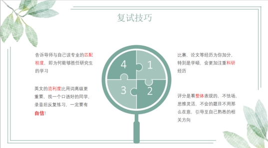杨莉学姐主要分享了学校与专业的选择、初试与复试经验、心态与作息方面的经验。在选择学校与专业上,提醒同学们要结合自身水平、兴趣爱好、和未来职业规划,还要考虑性价比;对于初复试,学姐提供了自己的学习经验和技巧。最后,学姐强调注重心态和作息,保持良好的心态,作息规律也是考研成功的因素。