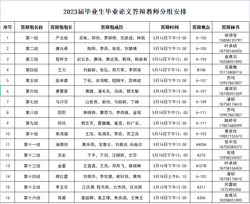 按照学校《关于2023届本科生毕业论文(设计)工作安排的通知》的要求,确保雷速体育投注 2023届毕业生毕业论文开题答辩工作高效、有序开展,同时方便各答辩组教师灵活安排,雷速体育app 决定采用分组、分时的方式进行开题答辩,拟安排在5月16日-18日进行毕业论文答辩。现将答辩教师分组及答辩时间公布如下: