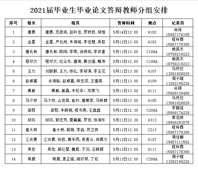 按照学校《关于2021届本科生毕业论文(设计)工作安排的通知》的要求,确保雷速体育投注 2021届毕业生毕业论文开题答辩工作高效、有序开展,同时方便各答辩组教师灵活安排,雷速体育app 决定采用分组、分时的方式进行开题答辩,拟安排在5月11日-14日进行毕业论文答辩。现将答辩教师分组及答辩时间公布如下: