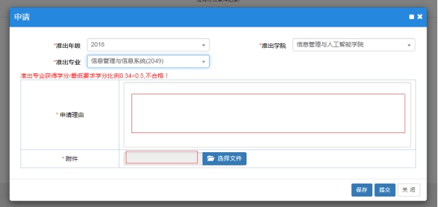 3. 主修准出专业申报条件:主修准出其他专业须满足修读完成课程学分比例达到准出专业的50%,若未达到准出专业的50%,通过课程替代可达50%者,需提交申请理由和替代说明附件,再提交申请。