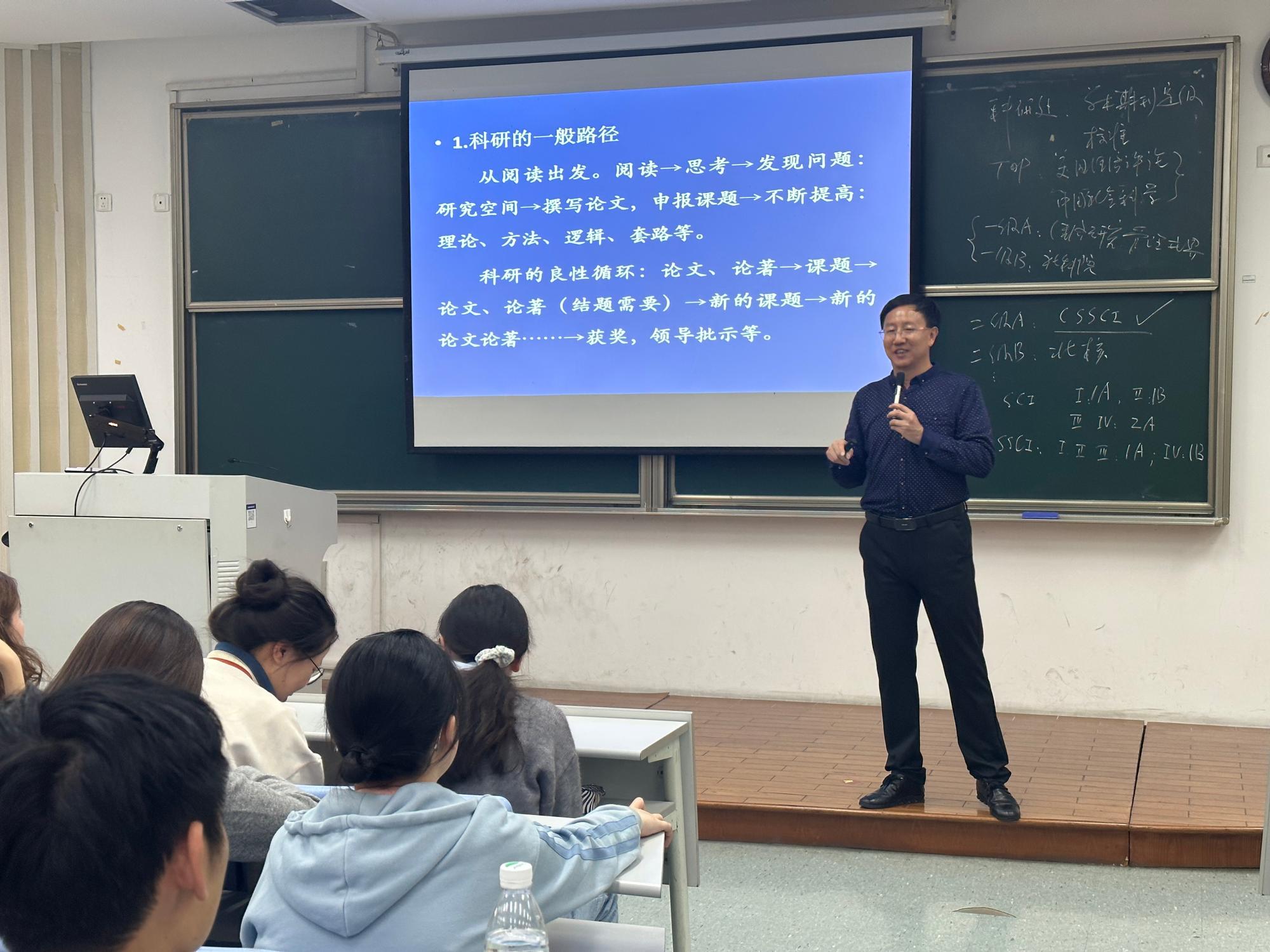 首先,邱风教授从“科研的一般路径”、“论文的选题”、“开题报告和正文撰写的主要关注点”三个部分,向同学们介绍如何撰写一篇优秀的本科毕业论文。接着,邱风教授详细地给同学们讲解了论文的重点是什么,以及在具体撰写论文时需要注意的要点。此外,他还介绍了论文的常见研究方法,并提醒大家研究论文要专注于一个领域,唯有在一个领域里深挖,才能成为该领域的专家。